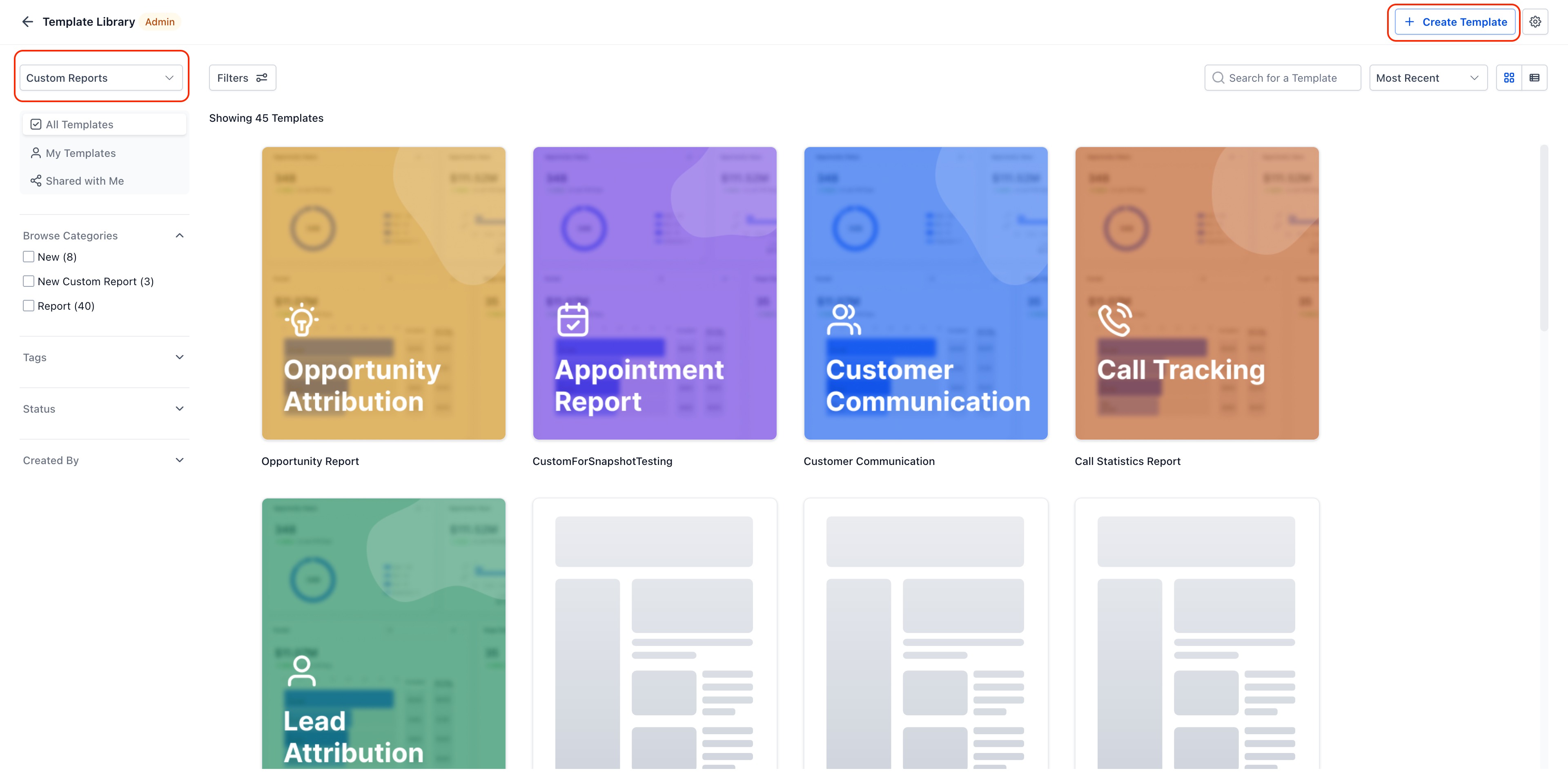 The Custom Reports Template Library is an in‑app gallery of professionally designed report layouts for Reporting › Custom Reports. Instead of building from scratch, you can start with a template, tailor branding, and schedule PDFs or emails. Templates help agencies enforce design standards and accelerate client reporting.