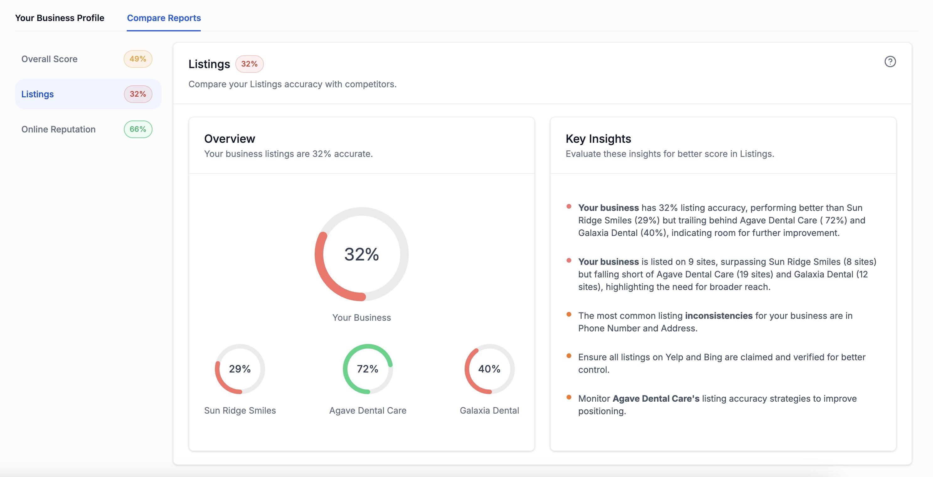 Review the accuracy, completeness, and optimization of your business listings compared to your competitors.Online Reputation (Reviews) Comparison