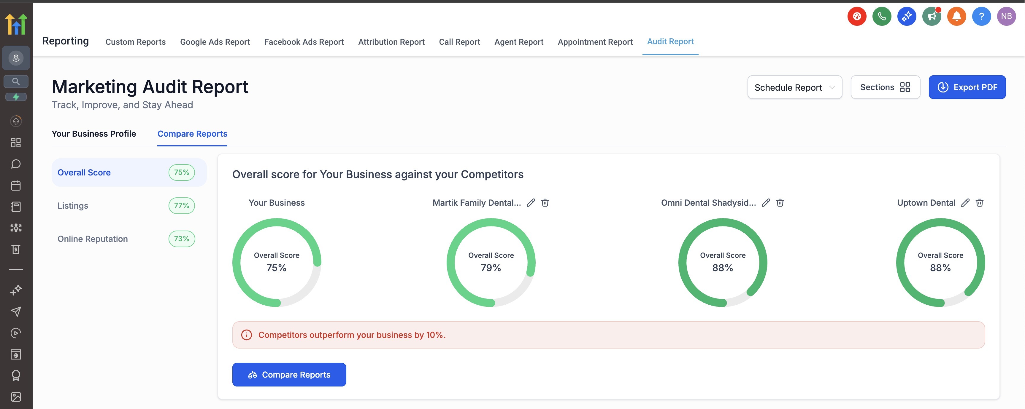 Once your Marketing Audit is generated, go to the Compare Reports tab.Add Up to 3 Competitor Businesses