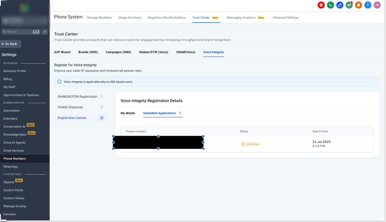 Voice Integrity is a game-changing feature that helps protect your business calls from being flagged as “Spam Likely.” By registering your U.S.-based phone numbers with top caller ID analytics providers—First Orion, Hiya, and TNS—you can improve pickup rates and reinforce your brand’s trustworthiness.