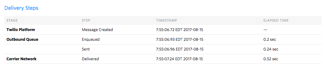 The Delivery Steps section of this log will show you when the request was created, how long it was queued on Twilio's platform, and when it was sent out to our carrier partner for delivery. These factors can help you determine where an undelivered message failed, or investigate latency issues.