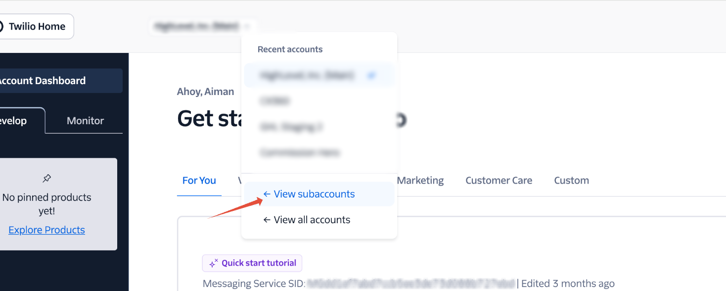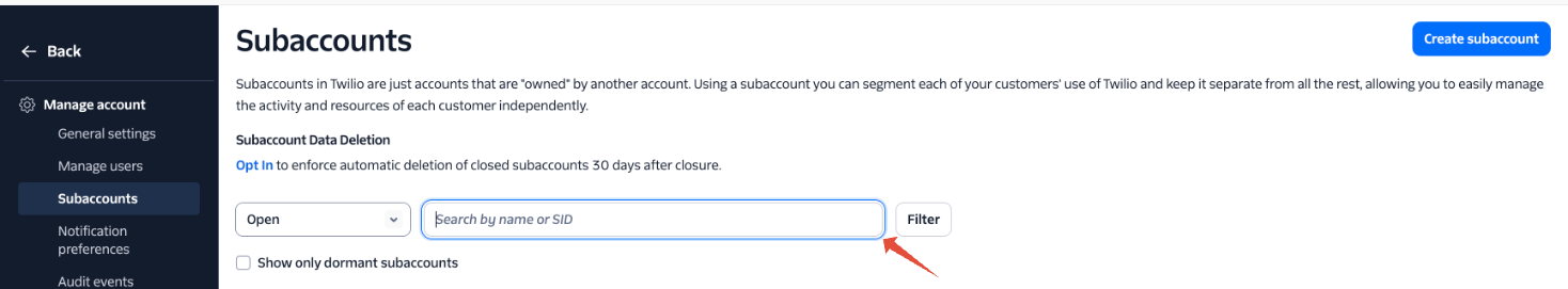 In Twilio, search for that Subaccount SID and open it.