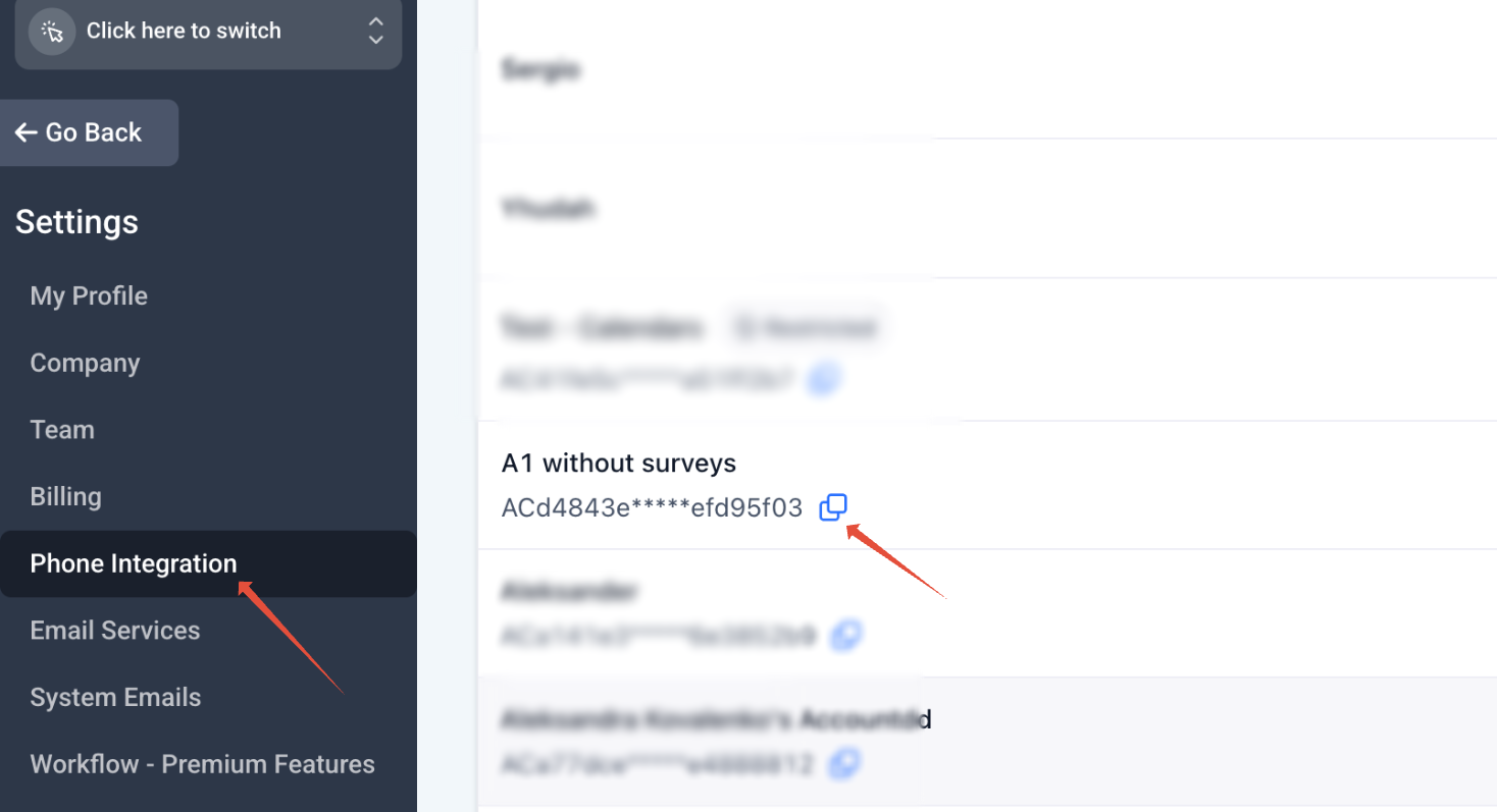 If there are too many subaccounts, go back to HighLevel (HL) and copy the Account SID for the location.
