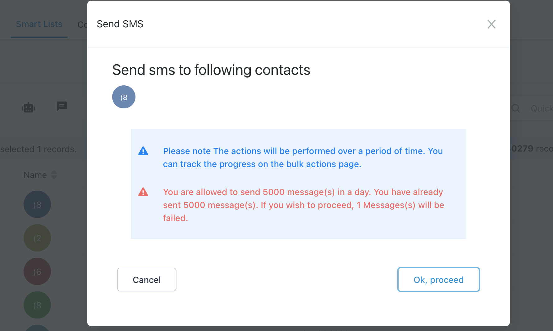 - Bulk Action: You are allowed to send 5000 message(s) in a day. You have already sent 5000 message(s). If you wish to proceed, 1 Message(s) will be failed.